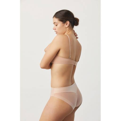 Braga altura Midi de microfibra, con la parte trasera de tul elástico con bordes planos y efecto tanga. El tejido principal es una microfibra muy suave que se adapta a tu cuerpo como una segunda piel. La zona íntima cuenta con un refuerzo de rizo de algodón.
