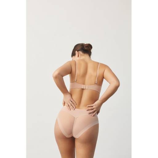 La comodidad de la braguita y la invisibilidad del tanga gracias al tejido invisible elástico y de gran adaptabilidad de su parte posterior.